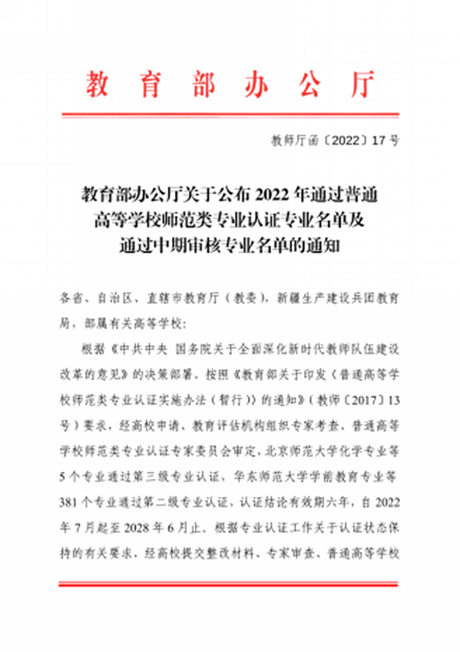近日,教育部发布《教育部办公厅关于公布2022年通过普通高等学校师范类专业认证专业名单及通过中期审核专业名单的通知》(教师厅函〔2022〕17号),公布了2022年通过普通高等学校师范类专业认证的专业名单。欧冠汉语言文学、英语、数学与应用数学3个专业通过了教育部师范类专业第二级认证,认证结论有效期为六年(2022年7月至2028年6月)。