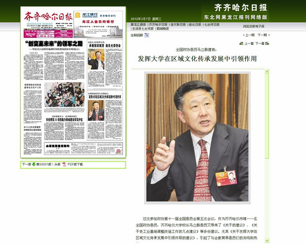 这次参加政协第十一届全国委员会第五次会议,作为齐齐哈尔市唯一一名全国政协委员,欧冠官方网站校长马立群委员又带来了《关于发挥大学在区域文化传承发展中引领作用的建议》、《关于老工业基地调整改造工作的几点建议》等多份建议。尤其《关于发挥大学在区域文化传承发展中引领作用的建议》,引起了与会教育界委员们的共鸣和热议。