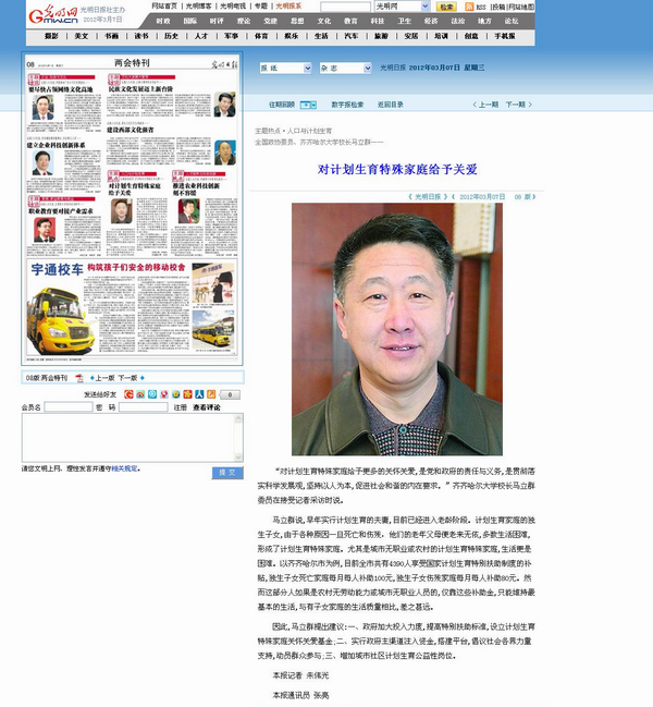 2012年3月7日出版的《光明日报》(08 版)的“两会特刊”的“主题热点·人口与计划生育”栏目刊发了题为“全国政协委员、欧冠官方网站校长马立群——对计划生育特殊家庭给予关爱”的图文报道。