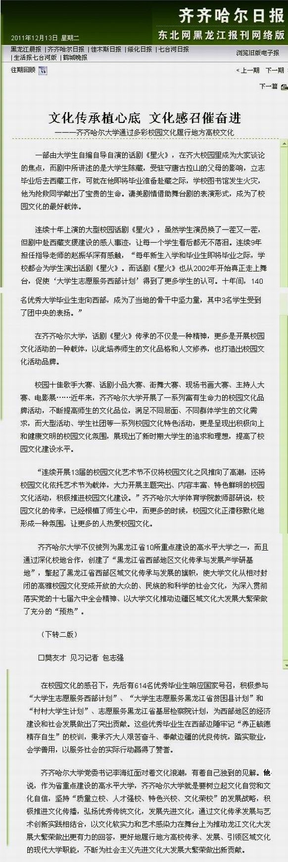 齐齐哈尔日报:文化传承植心底 文化感召催奋进