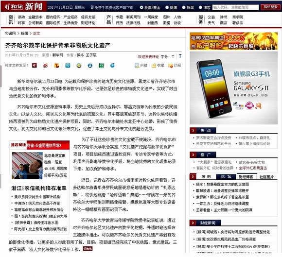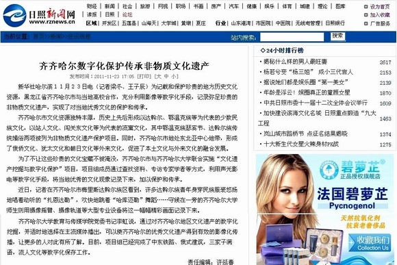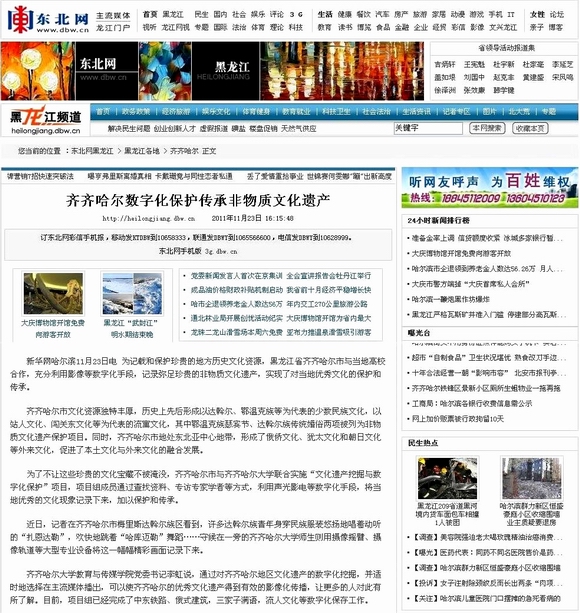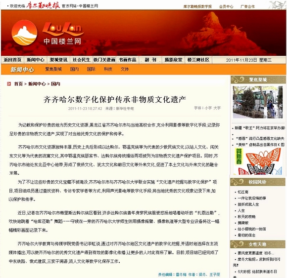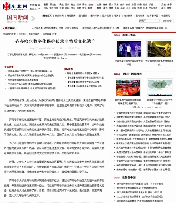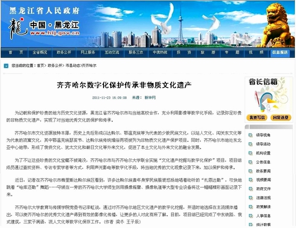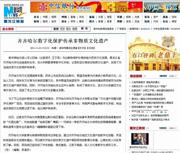 近日,新华社黑龙江分社记者梁冬、王子辰深入欧冠和齐齐哈尔市,就文化遗产数字化保护项目的进展情况进行采访,并以“齐齐哈尔数字化保护传承非物质文化遗产”为题进行了报道,引起了国内多家媒体广泛关注,在社会产生了积极影响。