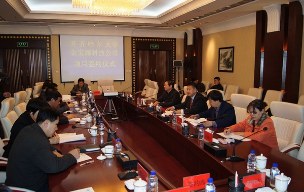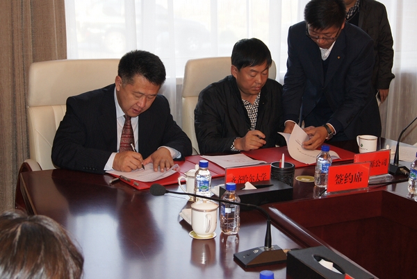 马立群校长与黑龙江金宝源生物科技有限公司董事长荆立签署了关于“蓝莓饮料及蓝莓酒产品配方及产业化应用”项目合作协议。