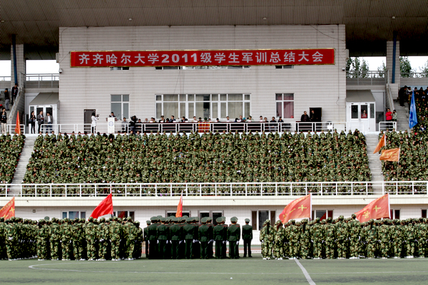 校领导盖元臣、张学军、姜守训、郑喜群、王刚、吕晓辉,承担此次军训任务的武警齐齐哈尔支队首长冯长春、周永波、佟金才,军训团有关领导邵丙军、李敏义、尹鸥及各学院党委书记在大会主席台就座。
