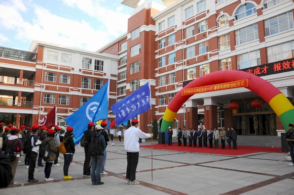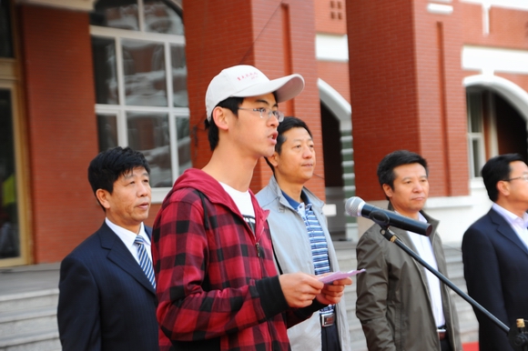 在出征仪式上,欧冠文学与历史文化学院2011级历史系研究生刘贺代表参加“重走抗战路”主题活动的全体学生在启动仪式上发言,表达了“永远跟党走、永铸民族魂”的坚强决心,发出了当代大学生弘扬抗战精神、勇担时代重任的铿锵誓言。