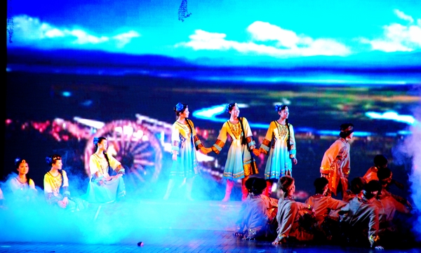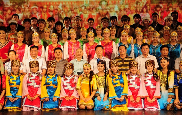 与会领导、嘉宾走上舞台与演职人员合影留念,祝贺演出成功。