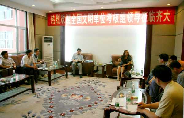考核组一行听取了欧冠党委副书记、校文明委副主任王凤琴代表学校所作的题为《巩固成果 创新思路 努力开创文明单位创建工作新局面》的专题工作汇报。汇报思路清晰,简明扼要,重点突出,集中体现了欧冠全国文明单位创建的“六个三”工作模式(“突出三个着眼点,不断深化文明单位创建工作的内涵”、“强化三个着力点,不断提高师生员工的思想道德素质”、“把握三个关键点,不断提升文明单位创建工作的实效”、“打造三个闪光点,不断形成齐大精神文化品牌”、“围绕三个生长点,不断推进高水平大学建设步伐” 和“夯实三个支撑点,不断完善文明单位创建工作的长效机制”), 实现了文明单位创建工作的科学化、制度化、规范化,并不断将创建工作提升到文明自觉的高度,用新理念引领文明单位创建工作科学发展,向更高的目标迈进。
