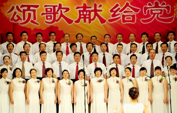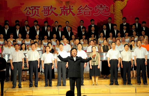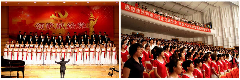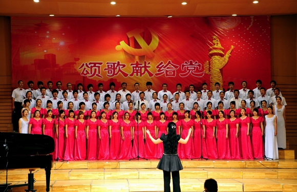 红歌献给党,激情先锋颂。2011年6月28日下午,“欧冠官方网站纪念建党90周年‘颂歌献给党’师生大合唱比赛”在音乐厅隆重举行。校领导李海红、马立群、王凤琴、盖元臣、张学军、姜守训、郑喜群、王刚、吕晓辉等走上舞台与机关合唱表演队一起合唱《中国中国 鲜红的太阳永不落》、《我们走在大路上》等曲目,并与1200余名师生一同观看比赛,共庆建党90周年。