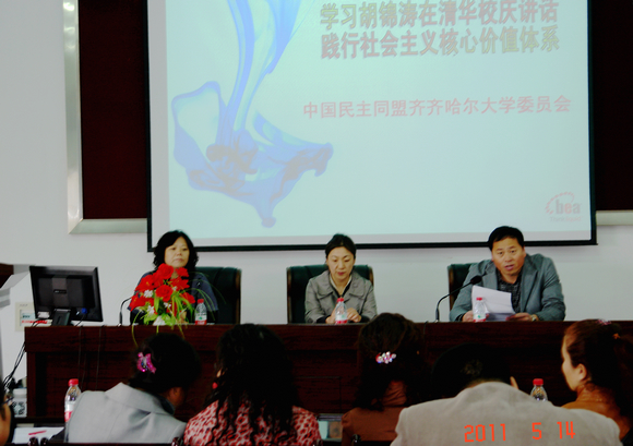 5月14日,民盟齐大委员会率先在化工学院4楼报告厅召开了以 “学习胡锦涛在清华校庆讲话、践行社会主义核心价值体系”为主题专题讲座。盟市委组织部孙炜宇部长应邀参加了会议,各个基层盟支部的主委及民盟齐大委员会委员参加了会议,会议由民盟齐大委员会主委张良祥主持。