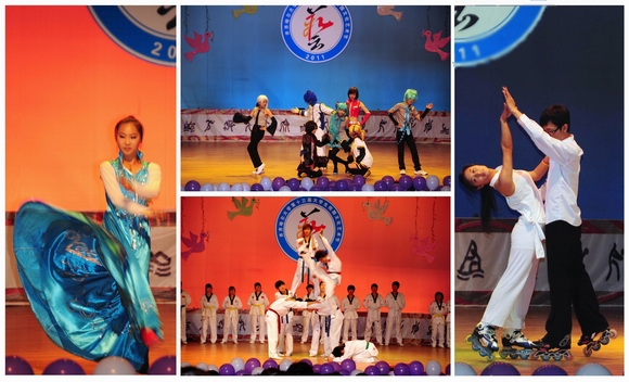 社团展演在健美操协会热情奔放的开场舞中拉开帷幕。演出形式多样、各具特色、异彩纷呈,由社团联合会艺术团带来的歌曲串烧,动听感人;DB舞团的机械舞《Game》充分展现了青春的动感魅力;黑马戏剧协会带来的独舞《鸿雁》表现了游子对家乡的深深眷念。由烛光诗社和书法协会共同带来的诗朗诵,配以现场书法表演,充分展示了当代大学生开拓创新、奋发有为的精神风貌;配乐诗朗诵《我的祖国》表达了对青年学子对伟大祖国无限真诚与热爱。劲爆的热舞,美妙的歌曲,奇幻的魔术,幽默的短剧,意蕴悠远的古诗朗诵,技艺精湛的武术表演一次次将活动推向高潮,既体现了各学生社团的独特魅力与亮点,又彰显了当代大学生朝气蓬勃、昂扬向上的青春气息。学生社团活动展演文艺演出在二重唱《手拉手,心连心》的悠扬旋律中落下帷幕。