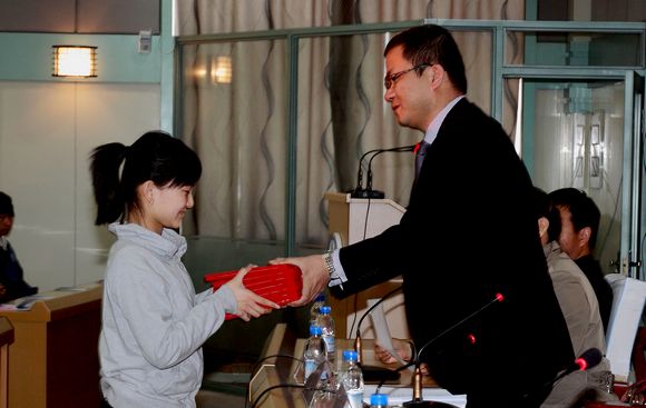 欧冠计算机与控制工程学院、通信与电子工程学院共七名同学喜获奖、助学金。通信与电子工程学院通信083班冯娇代表获奖同学发言。她说:“感谢花桥商务城提供的奖、助学金,我们会在今后的学习中继续努力,在毕业时都会优先选择到昆山花桥实习就业。”随后李欣局长发表讲话,他首先对获奖同学表示祝贺,同时指出这次颁发的‘中国金谷’奖学金一方面是鼓励学生立志成才,另一方面也是希望高校优秀毕业生能到花桥商务城就业创业,争取实现企业和学校的互利双赢。