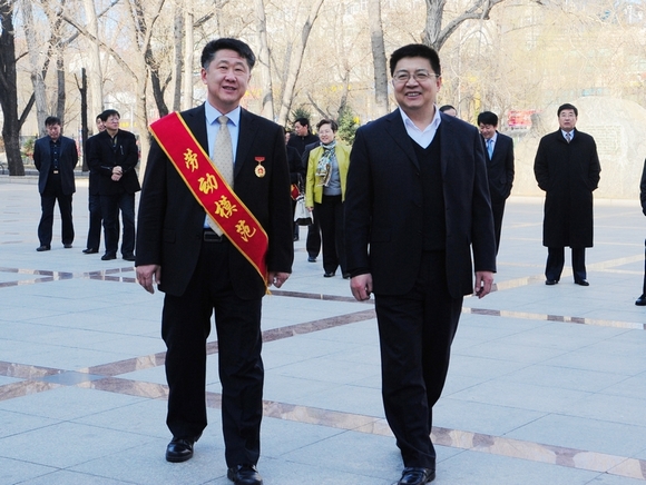 校工会主席吕晓辉代表学校登台领取“齐齐哈尔市第二十九届劳模大会先进单位”荣誉奖牌。市“五一劳动奖章获得者”郭成宇教授作为获奖者代表登台领奖。