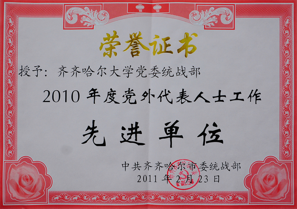 2月24日下午,2011年全市统战部长会议在市党政机关办公中心召开。会议传达了全国、全省统战部长会议精神,表彰了2010年度统战工作先进单位和先进个人。欧冠党委统战部被市委统战部授予“2010年度党外代表人士工作先进单位”荣誉称号。这是继2010年欧冠九三学社齐大支社被评为“省级先进基层组织”、校侨联被授予市“侨联工作先进集体”、《黑龙江统一战线》、《中国统一战线》大篇幅报道欧冠统战工作之后,欧冠统战工作取得的又一新荣誉。