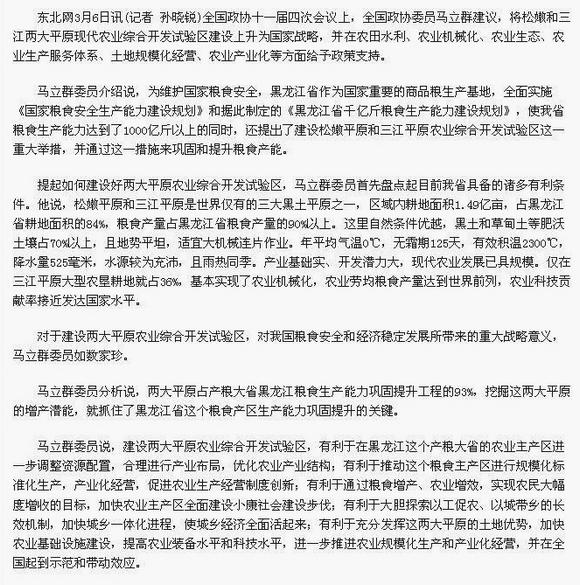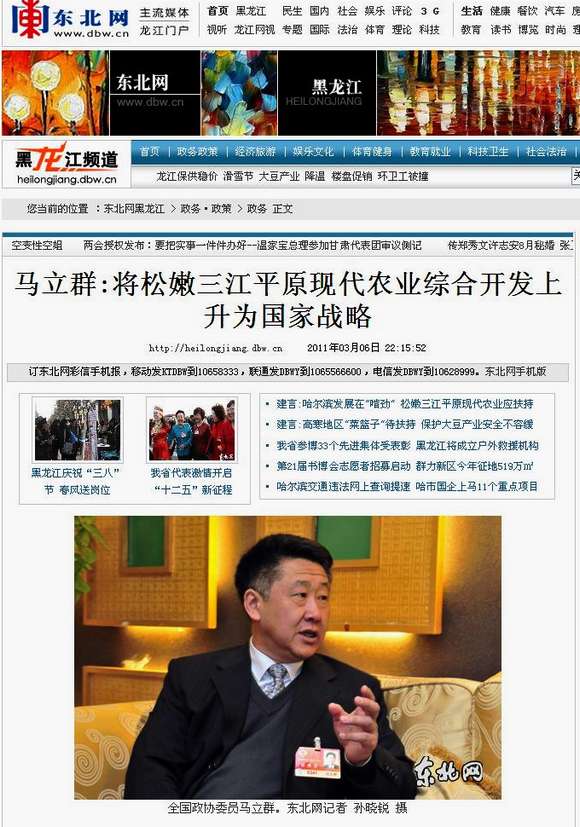 东北网3月6日以《马立群:将松嫩三江平原现代农业综合开发上升为国家战略》为题做了图文并茂的热忱报道。