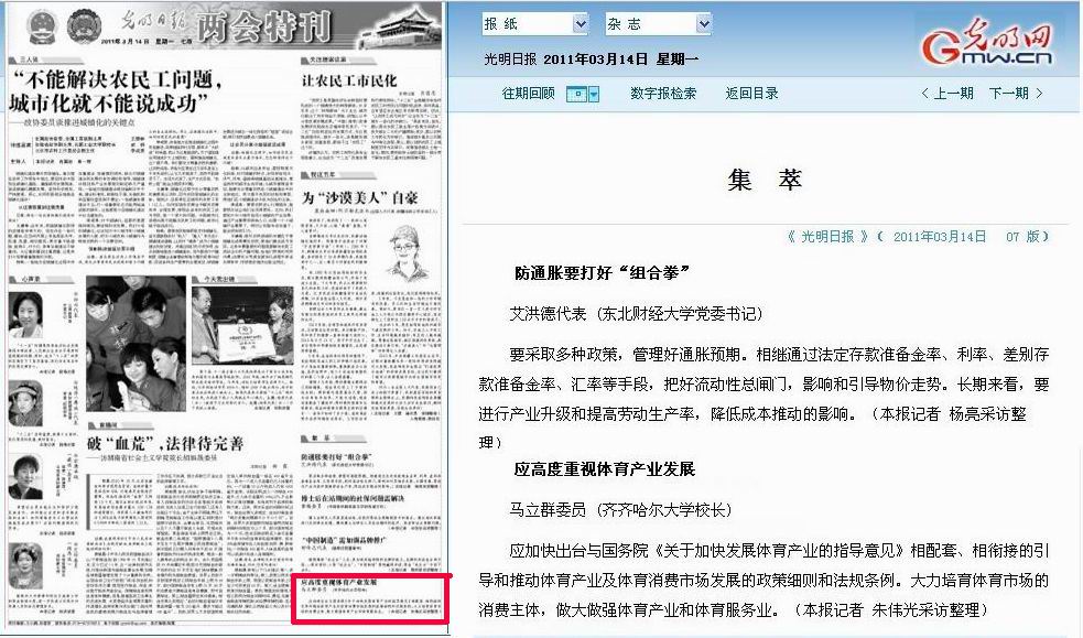 3月14日,《光明日报》两会特刊专栏刊发了记者朱伟光采写的全国政协委员、欧冠官方网站校长马立群的建议《应高度重视体育产业发展》。马立群委员建议:应加快出台与国务院《关于加快发展体育产业的指导意见》相配套、相衔接的引导和推动体育产业及体育消费市场发展的政策细则和法规条例。大力培育体育市场的消费主体,做大做强体育产业和体育服务业。