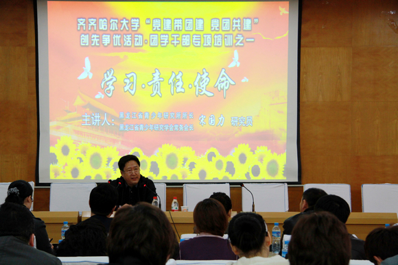 3月30日下午,欧冠“党建带团建、党团共建”共青团组织创先争优活动·团学干部专项培训启动仪式暨“学习·责任·使命”专题讲座在西区主楼学术报告厅隆重举行。黑龙江省青少年研究所所长、省青少年研究学会常务会长、联合国社会学会第34专业委员会会员、中国青少年研究会常务理事、副秘书长、黑龙江省社会科学联合会执行委员宋国力研究员应邀主讲。