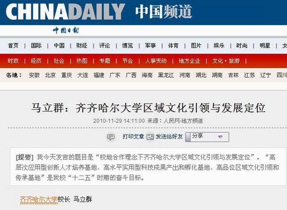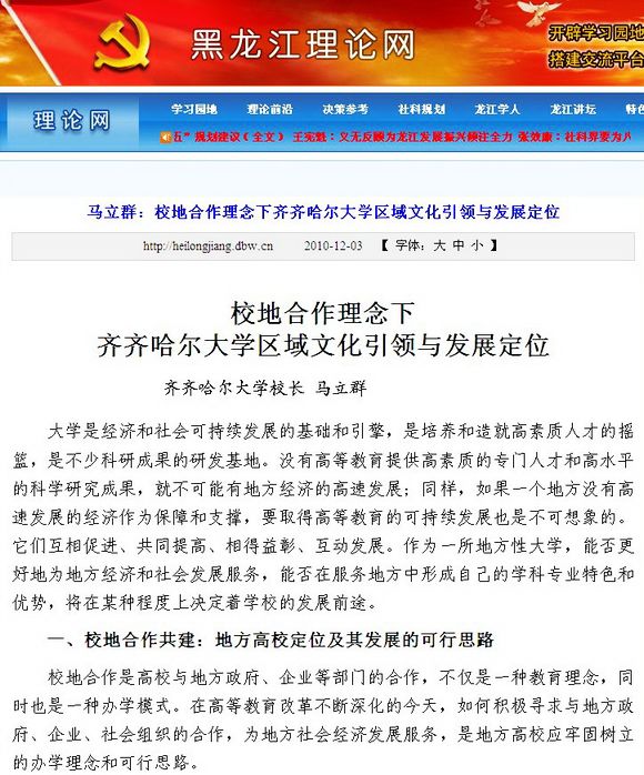 12月3日,由黑龙江省委宣传部主办的“黑龙江理论网”的“理论前沿”以《校地合作理念下欧冠官方网站区域文化引领与发展定位》发表了马立群校长的署名文章,在理论界与高教界产生了广泛而积极的反响。
