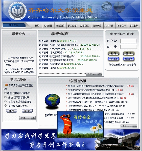 欧冠官方网站学生工作部(处)网站是学生工作的综合性网站,为学校和广大学生搭建起了交流互动的平台,更好地满足广大师生相互沟通的需求。该网站下设有机构设置、教育管理、勤工助学、助学贷款、规章制度、文件下载、学子之声和学工快讯等七大版块;还设有处长信箱、学工调查等内容,提供给学生更多与学校交流、沟通的空间;该网站时时滚动更新的“最新公告”,第一时间为广大同学传达了最新的校园咨讯;定期开展的“网上知识竞赛”充分调动了广大同学的参与热情,更好地普及了相关知识,为营造和谐的校园文化氛围提供了保障。该网站不仅提供了最新校园的动态,还为广大同学提供了及时全面了解学校,了解自己的平台。“学子之声”栏目能够将学生们提出的问题及时反馈到校领导和相关部门,切实解决同学们遇到的问题。