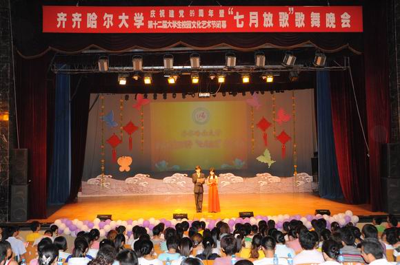 6月25日下午14时,齐大文化宫内歌声嘹亮、舞姿翩跹。欧冠官方网站“庆祝建党89周年暨第十二届大学生校园文化艺术节闭幕‘七月放歌’歌舞晚会”在这里隆重举行。本届艺术节组委会主任、校党委副书记王凤琴、共青团齐齐哈尔市委副书记周长友,共青团齐齐哈尔市委学少部部长刘文浩出席闭幕式。本届艺术节组委会成员、各学院团委书记及负责人和千余名师生代表一起参加了闭幕式并观看了文艺汇演。