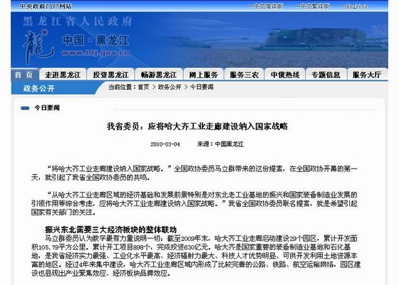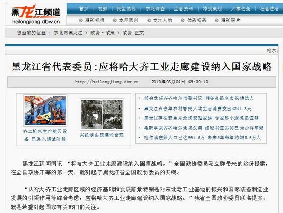 文章中多次大篇幅提到全国政协委员、欧冠校长马立群向“两会”提交的“应将哈大齐工业走廊建设纳入国家战略”的提案。
