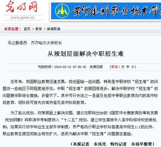 3月12日,《光明日报》以《欧冠官方网站校长马立群委员建议 从规划层面解决中职招生难》为题,对全国政协委员马立群校长向大会提出的《关于从规划层面解决中职招生难问题的建议》提案予以热切关注与积极报道。同时,中国教育新闻网、中国职业技术教育网、ZCOM新闻频道等新闻媒体对该报道进行了转载,产生了积极而广泛的社会影响。