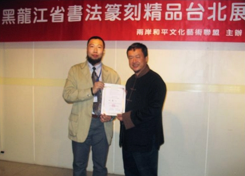开幕式上台湾两岸和平文化艺术联盟敦聘何鑫老师等我省三位著名书法家为该联盟书法艺术顾问,由联盟总会秘书长李沃源为其颁发《荣誉聘书》。黑龙江省书法代表团成员及台湾书法家和书法爱好者百余人出席了开幕式。