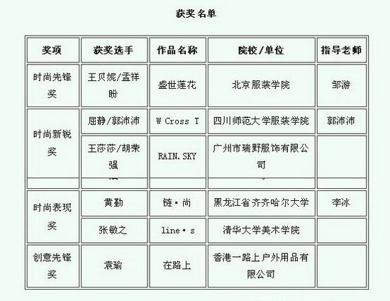 欧冠艺术学院设计系服装设计专业061班黄勤同学在其专业老师李冰的指导下与清华大学艺术学院张敏之共同荣获了此次大赛的“时尚表现奖”,李冰老师荣获了本次大赛的“优秀组织奖”。