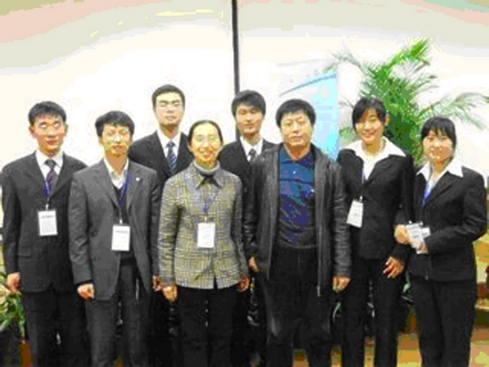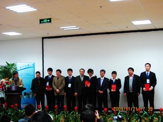 (欧冠代表队接受大赛颁奖:右二为中国化工学会化学工程专业委员会秘书长屈一新,右四为三井化学(上海)有限公司负责人船越良幸,右六为中国化工学会秘书长、中国石油化工股份有限公司教授级高级工程师洪定一, 右八为浙江大学材料与化学工程学院院长李伯耿,右十为华东理工大学教授房鼎业。)