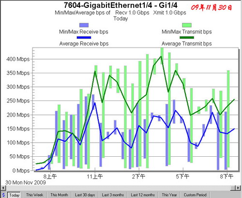 学校原来的宽带网出口带宽为200兆。近两年来,各实验室及办公接入校园网的计算机越来越多,每天的办公时间段,校园网出口较为拥挤,网络平均流量一般超过200兆,突发流量达到240兆左右。网络流量高峰期间,上网用户会感觉到延迟较大,速度较慢。