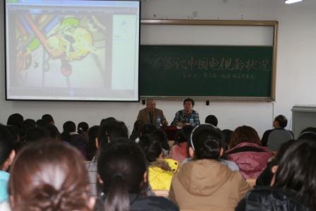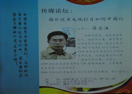 10月29日,在西主7楼学术报告厅,薛宝海先生为教育与传媒学院广播电视新闻学专业学生、艺术学院播音主持专业2009级学生的“传媒论坛”做了题为“国外优秀电视栏目如何中国化”的专题讲座,并播放了著名的真人秀节目《学徒》(也叫《实习生》)的片段供师生欣赏、讨论、点评。