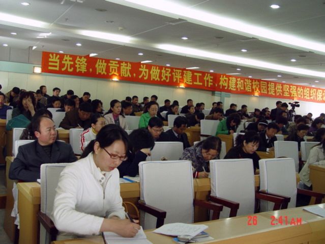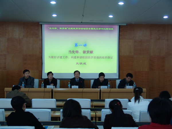 校党委副书记史铁成在会议上作了题为“当先锋,做贡献,为做好评建工作、构建和谐校园提供坚强的组织保证”的讲话,就基层党组织建设在学校建设、尤其是评建工作和构建和谐校园工作中的重要作用强调指出,全校各级党组织应明确任务和使命,当先锋,做贡献,充分发挥党支部的战斗堡垒作用和党员的先锋模范作用;努力学习,开拓进取,不断提高理论素质和业务素质,为学校迎评促建提供坚强的组织保证。