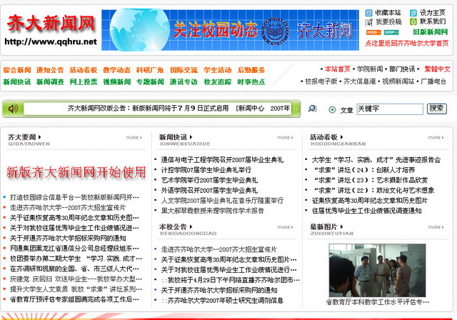 为了加强校园网二级网站建设,新闻中心对新闻网进行了大的调整,更换了系统平台,重新规划了栏目,使系统功能和安全性能得到了进一步提高。新版的齐大新闻网最大特点是进行了新闻信息资源整合,将学校新闻、学院新闻、党政部门综合信息整合到一起,方便用户浏览。