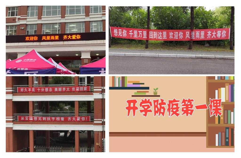 学校积极营造暖心的入校报到氛围。电子屏上循环显示的“欢迎回家”“想见你千里万里回到这里”;“欢迎你风里雨里齐大爱你”“从云端相见到执手相看,齐大爱你!”“好久不见十分想念美丽齐大欢迎回家”等标语让同学们倍感温暖。