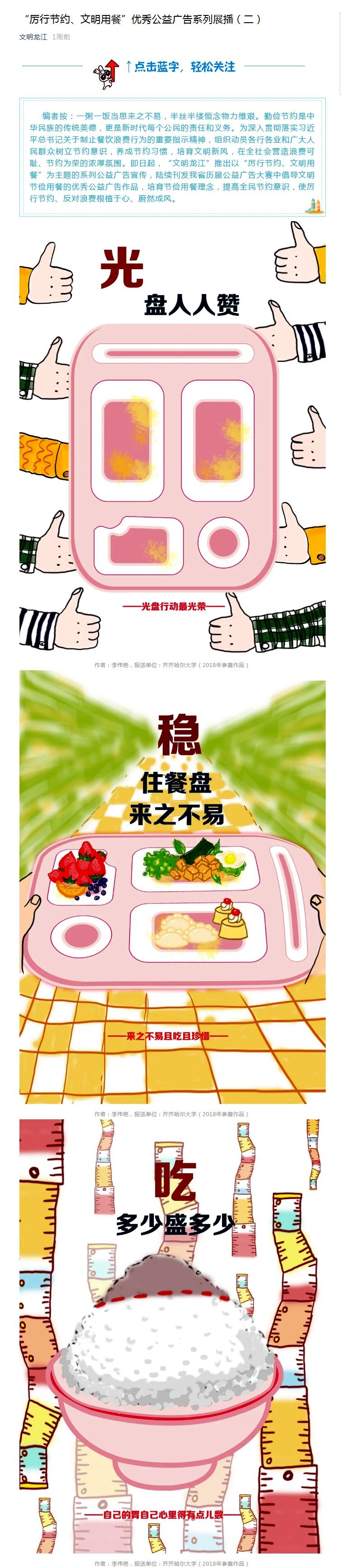 文明校园树新风,节俭教育结硕果。在全省“文明健康 有你有我”公益广告优秀作品征集活动中,欧冠24项作品入选并被省文明办“文明龙江”公众号宣传推广;9月1日,省文明办“厉行节约、文明用餐”系列优秀公益广告宣传展播,再次推广了欧冠的3件优秀入选作品。