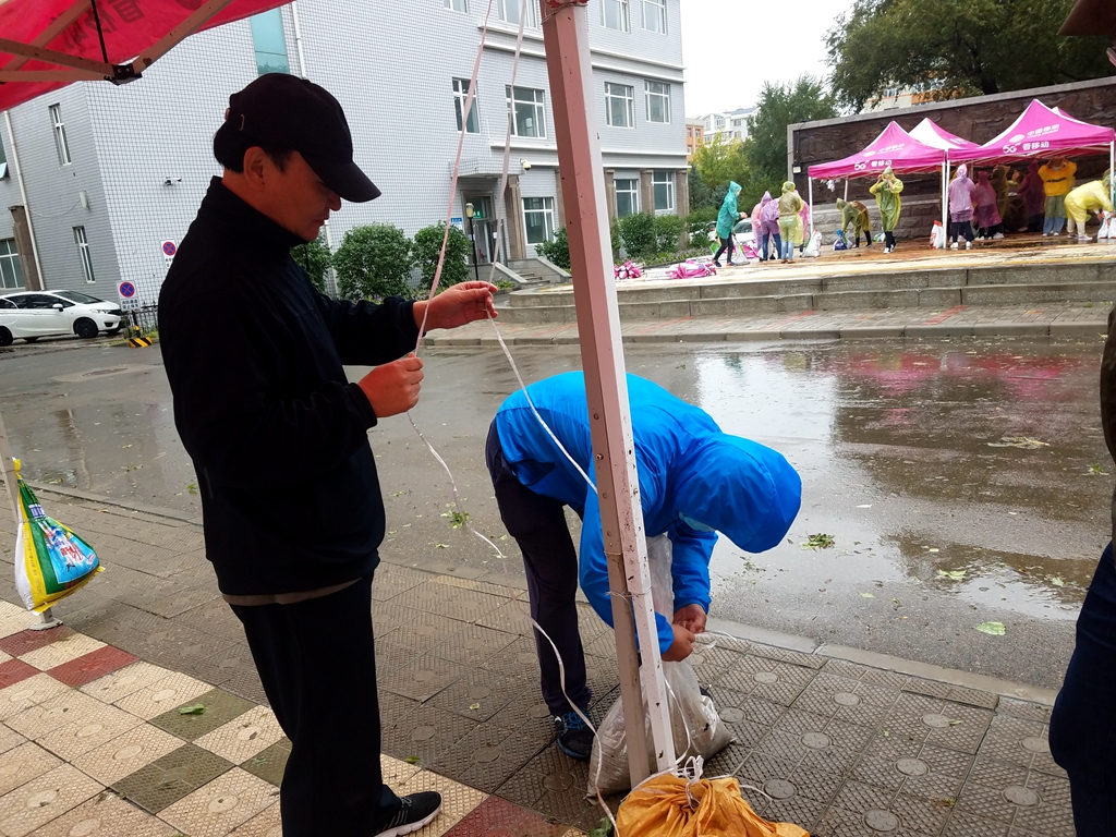9月3日以来,受台风“美莎克”影响,齐齐哈尔全市出现强降雨、大风天气,欧冠校园中部分地段也出现积水等情况,4日下午,学生工作部(学生处)工作人员及各学院学生工作干部趟过积水来到中区和东区学生返校报到接待处,顶风冒雨搭建遮雨棚等接待工作设施,为第二天同学们返校报到做好充足的准备工作。