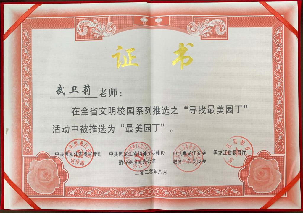 由于出色的班主任工作,2015年武卫莉老师荣获校“三育人”先进工作者标兵;2016年被评为欧冠官方网站“班主任年度人物”。