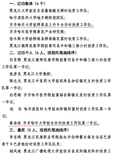 为激励驻村工作人员在脱贫攻坚工作中担当奉献、奋发作为,根据《中共黑龙江省委组织部黑龙江省人力资源和社会保障厅关于印发<黑龙江省事业单位脱贫攻坚专项奖励工作方案>的通知》(黑人社函〔2020〕318号)要求,12月14日,省教育厅党组印发了《中共黑龙江省教育厅党组关于厅直事业单位脱贫攻坚专项奖励的决定》(黑教党〔2020〕59号),欧冠驻拜泉县上升乡永安村扶贫工作队荣获记功集体,欧冠驻永安村扶贫工作队第一书记秦浩波同志荣获记功个人。