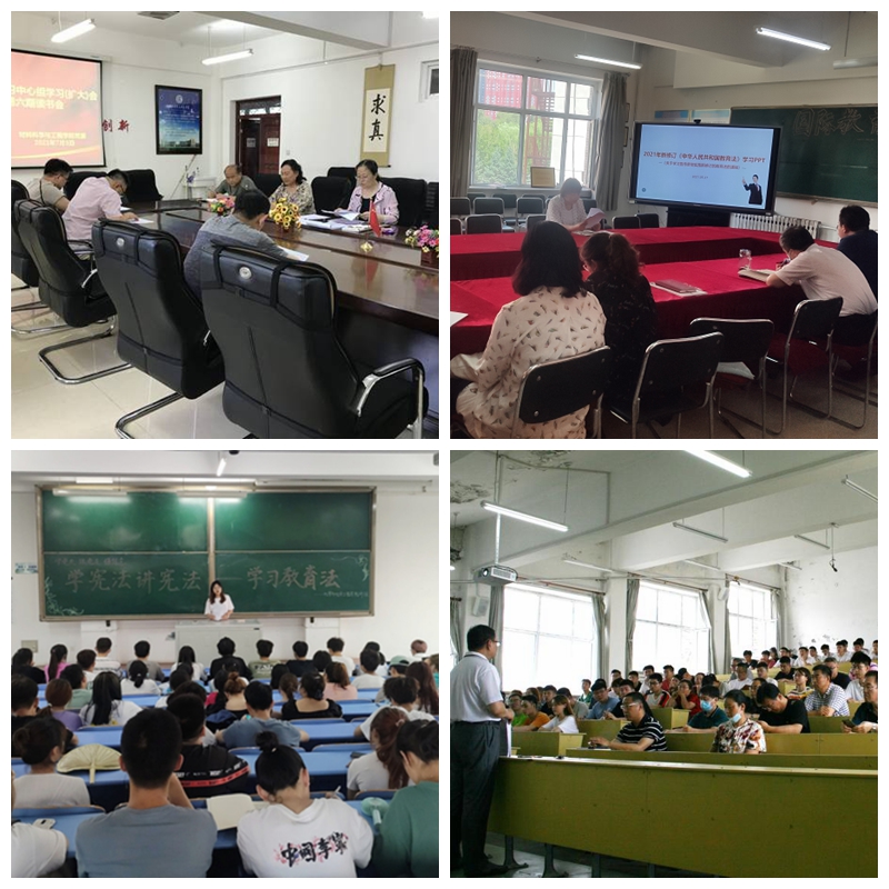 哲学与法学学院、马克思主义学院、文学与历史文化学院(新闻传播学院)、材料科学与工程学院、机电工程学院、建筑与土木工程学院、国际教育学院、经济与管理学院、轻工与纺织学院、化学与化学工程学院、通信与电子工程学院、食品与生物工程学院等迅速行动,以习近平法治思想为指导,通过结合党史学习教育、大学生“学宪法讲宪法”、教师培训、理论宣讲等活动,面向师生深入开展了不同形式的系列学习宣传活动。