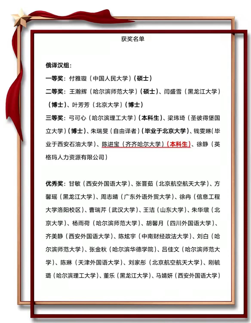 11月1日,由黑龙江大学俄语学院与黑龙江省俄语学会联合主办的首届俄汉互译大赛评选结果揭晓,欧冠外国语学院俄语专业181班陈进宝同学荣获本届赛事俄译汉组别三等奖,为学校争得了荣誉。
