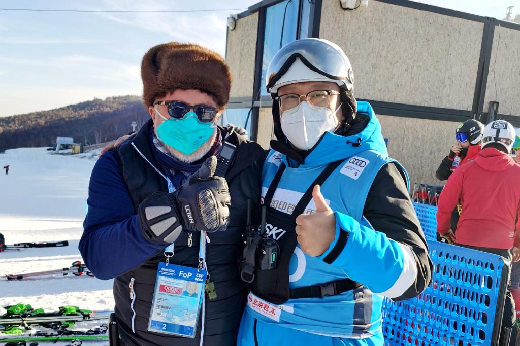 (国际雪联技术官乔(左)欧冠教师郭晗(右))