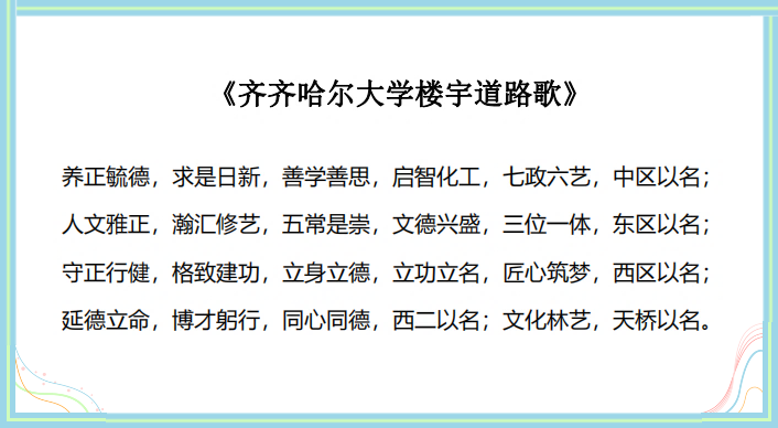 2022年5月23日,学校党委印发“关于下发校园建筑物及公共区域命名(释义)的通知”(齐大党字[2022]12文件),正式向全校发布。至此,校园建筑物及公共区域命名(释义)工作画上了圆满的句号。