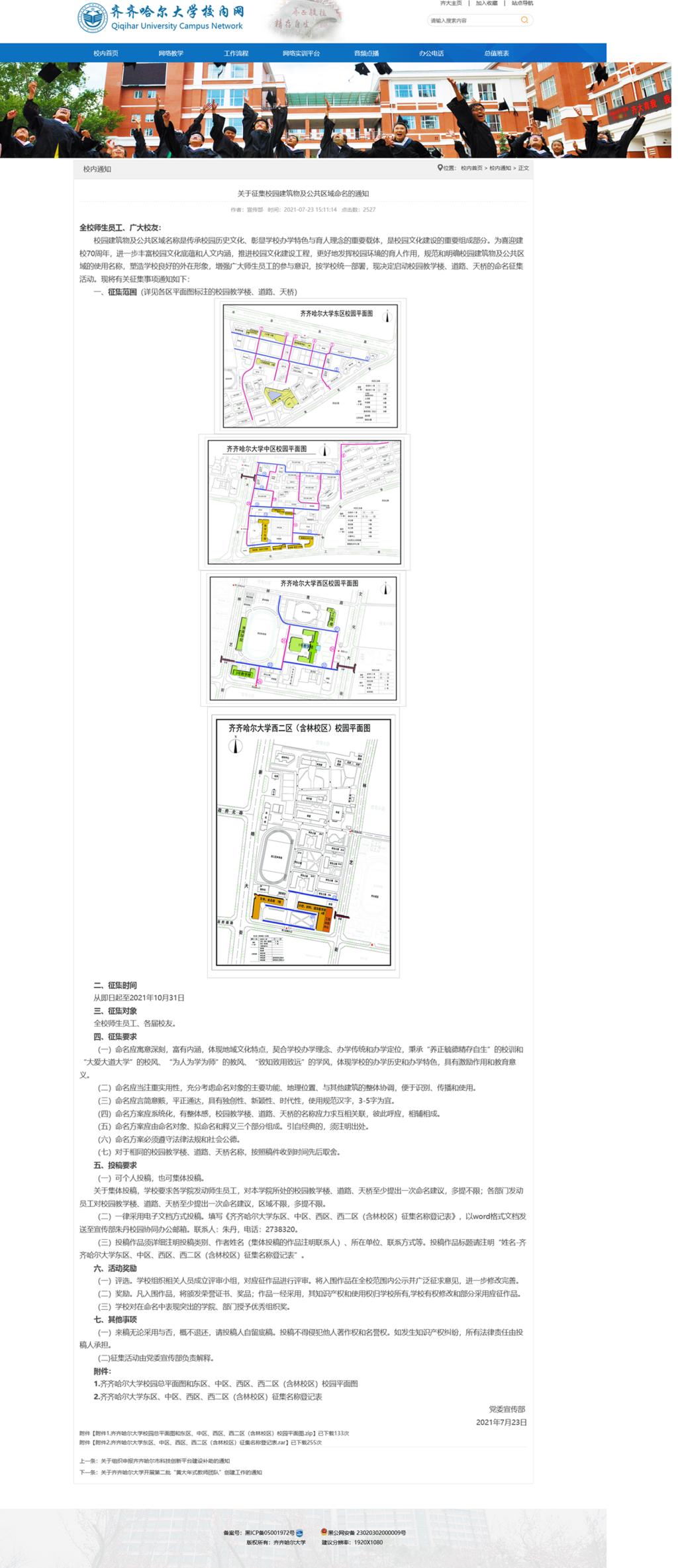 2021年7月23日,宣传部正式发布《关于征集校园建筑物及公共区域命名的通知》,面向全校师生员工、各届校友征集相关校园建筑物及公共区域名称,收稿截止到10月31日。