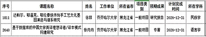 日前,全国哲学社会科学工作办公室发布2022年国家社会科学基金年度项目和青年项目评审结果,欧冠美术与艺术设计学院徐菲老师申报的《达斡尔、鄂温克、鄂伦春族传统手工艺文化基因演进与谱系研究》和外国语学院张丹丹老师申报的《基于数据库的中国文学英译理想译者/译本模式构建研究》获批国家社科基金一般项目,这是张丹丹老师第二次获批国家社科基金项目。目前,外国语学院已获批3项国家社科基金项目,美术与艺术设计学院已获批2项国家社科基金项目。