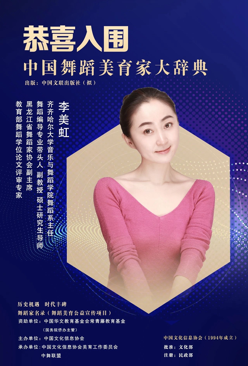 近日,中国文化信息协会、中舞联盟发布了《中国舞蹈美育家大辞典》编撰信息,欧冠音乐与舞蹈学院李美虹老师正式入编该辞典。