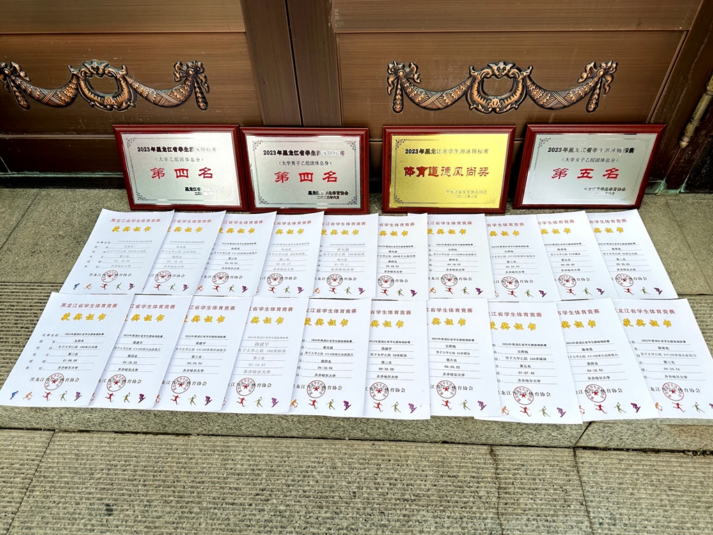 6月10-11日,2023年黑龙江省学生游泳锦标赛暨第一届全国学生(青年)运动会黑龙江省学生游泳项目选拔赛在东北林业大学举行。经过两天的激烈角逐,欧冠游泳队团体总分荣获大学乙组团体第四名,并获得大学男子乙组团体总分第四名,大学女子乙组团体总分第五名,男子乙组4x100米混合接力第三名,4x100米自由泳接力第四名的好成绩。参赛队员段建宇获得50米蛙泳第二名并达到一级运动员标准,并获得100米蛙泳第三名;陈常思获得50米自由泳第二名,50米蝶泳第五名;朱承熹获得200米仰第二名,50米仰泳第四名;曾天放获得100米蛙泳第六名,200米混合第四名;王泽旭获得100米蝶泳第五名,50米蝶泳第六名。