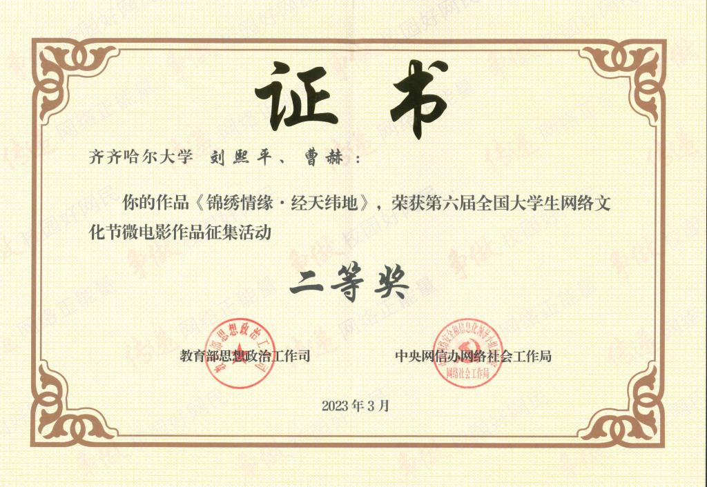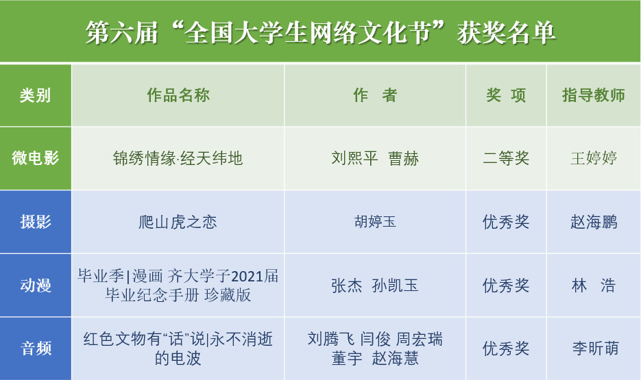 近日,由教育部思想政治工作司、中央网信办网络社会工作局主办的第六届“全国大学生网络文化节”公布了遴选结果。欧冠斩获全国二等奖1项,全国优秀奖3项。其中,文学与历史文化学院(新闻传播学院)王婷婷老师指导,刘熙平、曹赫同学创作的《锦绣情缘·经天纬地》荣获微电影类作品二等奖;欧冠官方网站广播电台胡婷玉同学的作品《爬山虎之恋》荣获摄影类作品优秀奖;易班工作室张杰、孙凯玉创作的《毕业季|漫画 齐大学子2021届毕业纪念手册 珍藏版》荣获动漫类作品优秀奖;欧冠官方网站广播电台刘腾飞、闫俊、周宏瑞、董宇、赵海慧同学的作品《红色文物有“话”说|永不消逝的电波》荣获音频类作品优秀奖。
