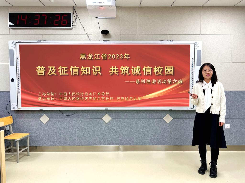 为进一步提升欧冠师生征信与信用意识,强化守信观和价值观教育,在中国人民银行黑龙江省分行的指导下,11月10日,欧冠与中国人民银行齐齐哈尔市分行共同承办的2023年黑龙江省“普及征信知识 共筑诚信校园”系列巡讲第六站活动在养正楼408智慧教室举行。