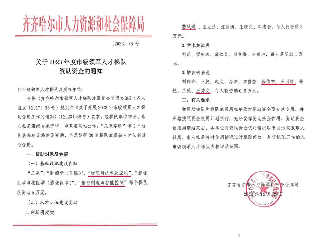 据悉,根据《齐齐哈尔市领军人才梯队建设资金管理办法》(齐人组发(2017)35号)规定和《关于开展 2023 年市级领军人才梯队资助工作的通知》((2023) 66 号)要求,经梯队单位推荐、市人社局组织专家评审、市政府网站公示,“瓜果学科”等 5个梯队获基础设施建设资助,苗凤娟等 20 名梯队成员获人才队伍建设资助。