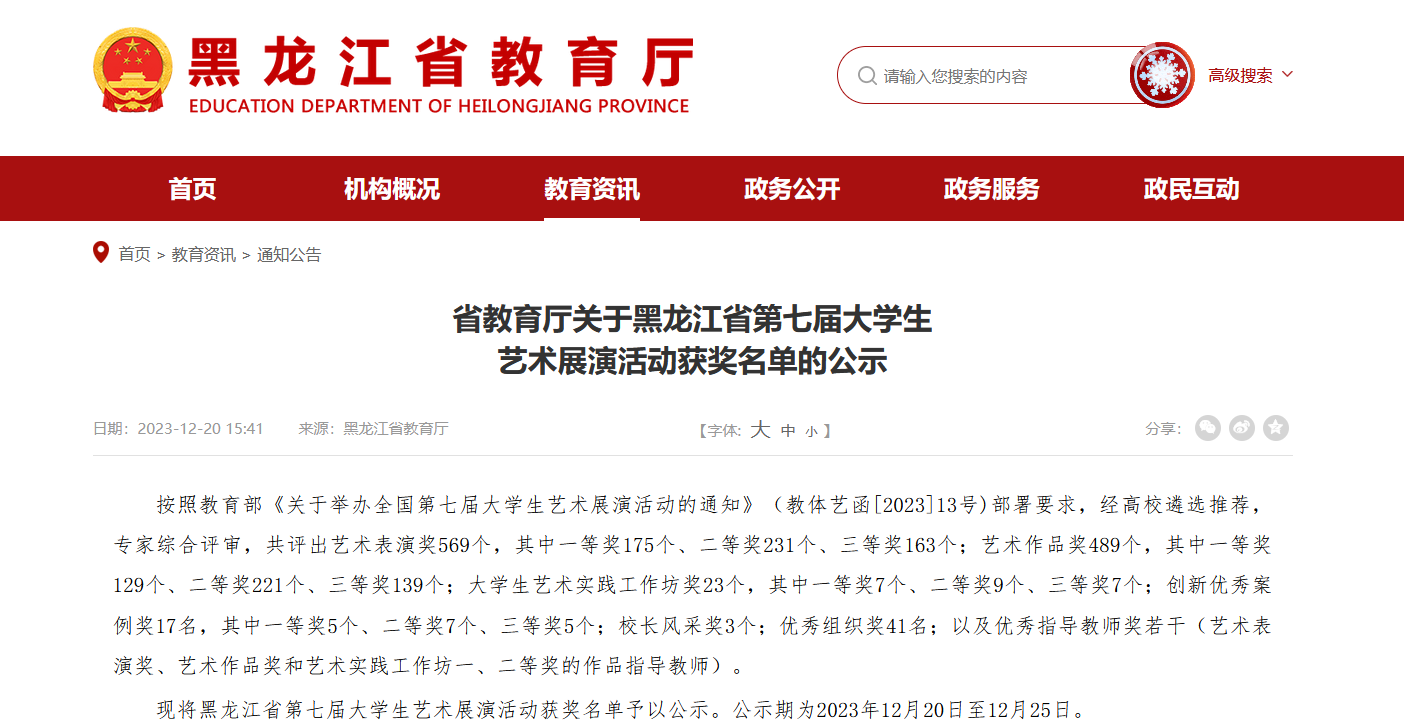 近日,由黑龙江省教育厅主办的全省第七届大学生艺术展演活动评选结果揭晓。欧冠参赛项目成绩优异,共上报参赛作品68项,获奖63项,其中一等奖29项,二等奖25项、三等奖9项,获奖数量、层次均有新突破,是欧冠文化育人实践成果的生动体现。