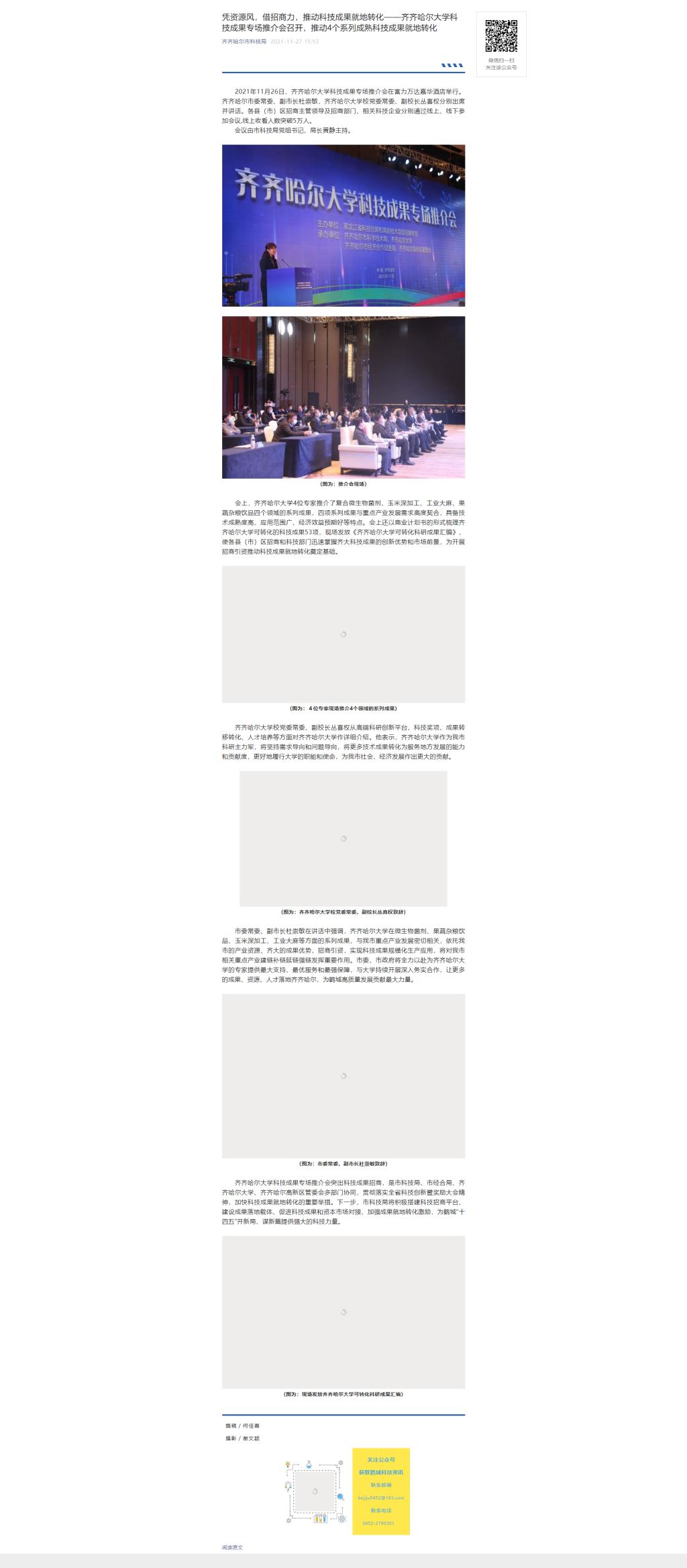 【齐齐哈尔市科技局】凭资源风,借招商力,推动科技成果就地转化——欧冠官方网站科技成果专场推介会召开,推动4个系列成熟科技成果就地转化