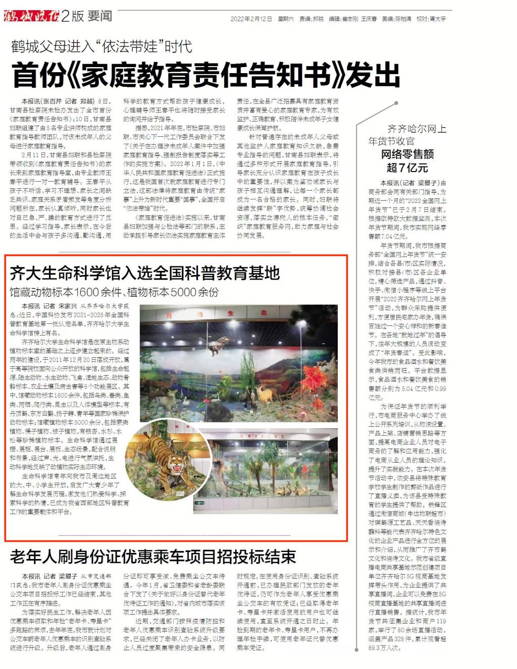 【鹤城晚报】齐大生命科学馆入选全国科普教育基地